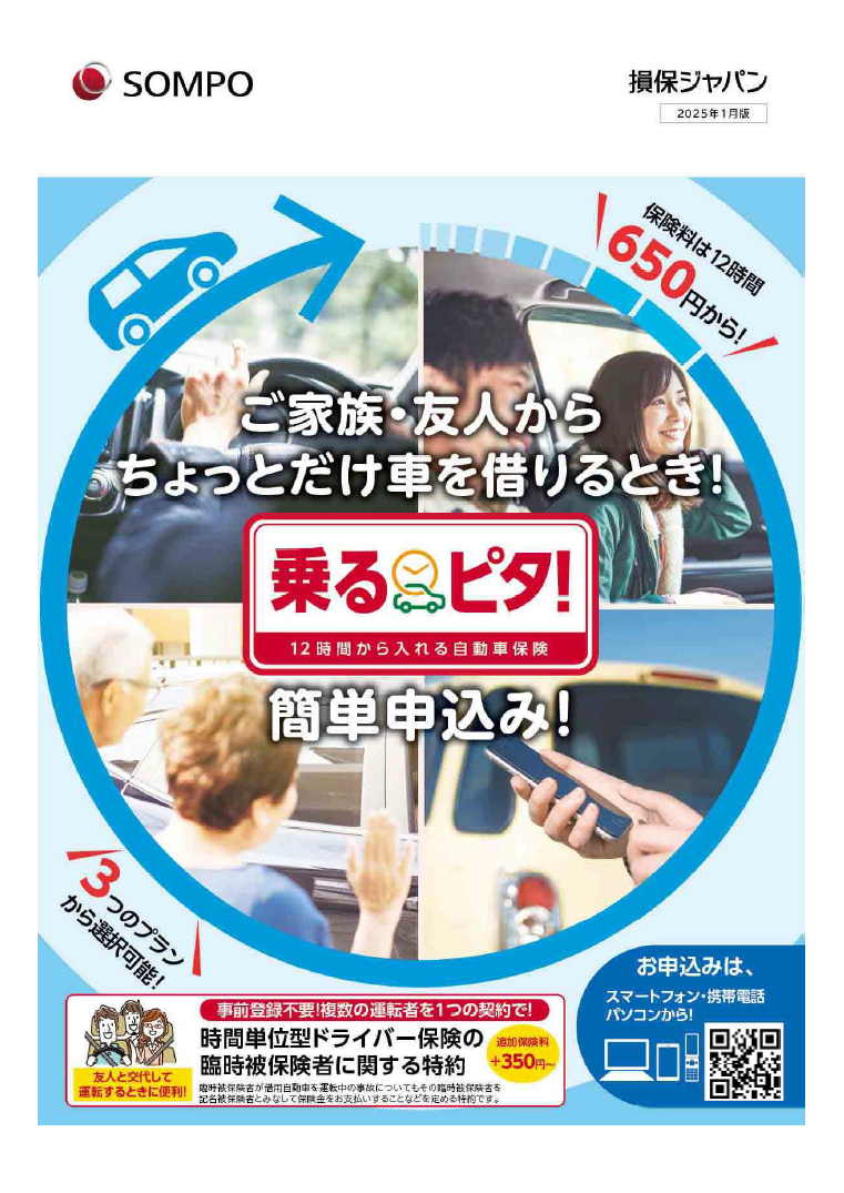 乗るピタ!はスマホひとつで簡単加入「帰省した時に親の車を借りて運転したい」、「友人の車を借りる」、「子供に車を貸すが年齢条件等対象ではない」、など12時間から加入できる自動車保険 お手続き完了後すぐに補償が開始そのまま出発OKだから安心!