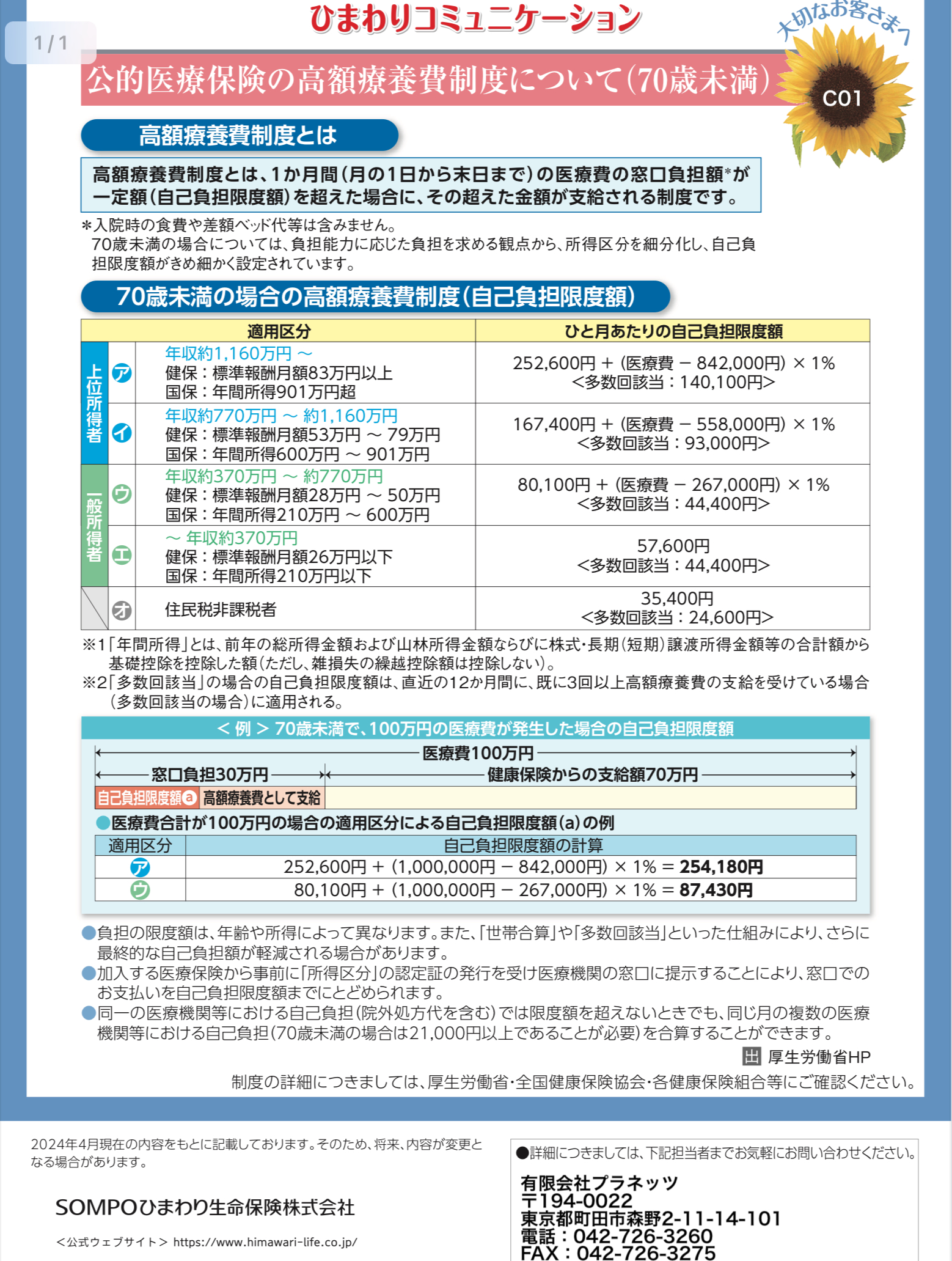 高額療養費制度とは、医療費の自己負担が限度額を超えた場合に、その超えた分を健康保険から払い戻してもらう制度です。この制度の仕組みや利用方法について、公的医療保険制度の詳細につきましては厚生労働省・全国健康保険協会・各健康保険組合等にご確認ください。