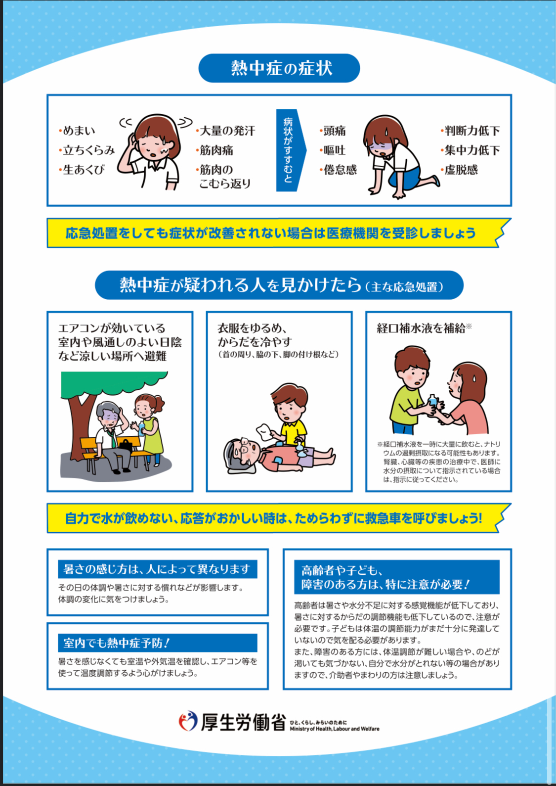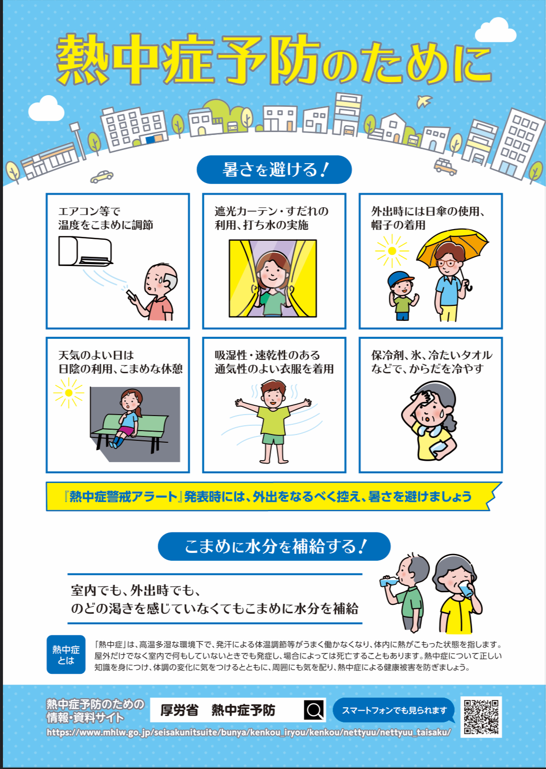 熱中症とは、高温多湿な環境下で、発汗による体温調節等が うまく働かなくなり、体内に熱がこもった状態をさします。屋外だけでなく室内で何もしていないときでも発症し、場合によっては死亡することもあります。熱中症について正しい知識を身につけ、 体調の変化に気をつけるとともに、 周囲にも気を配り、 熱中症による健康被害を防ぎましょう。 厚生労働省HPより引用