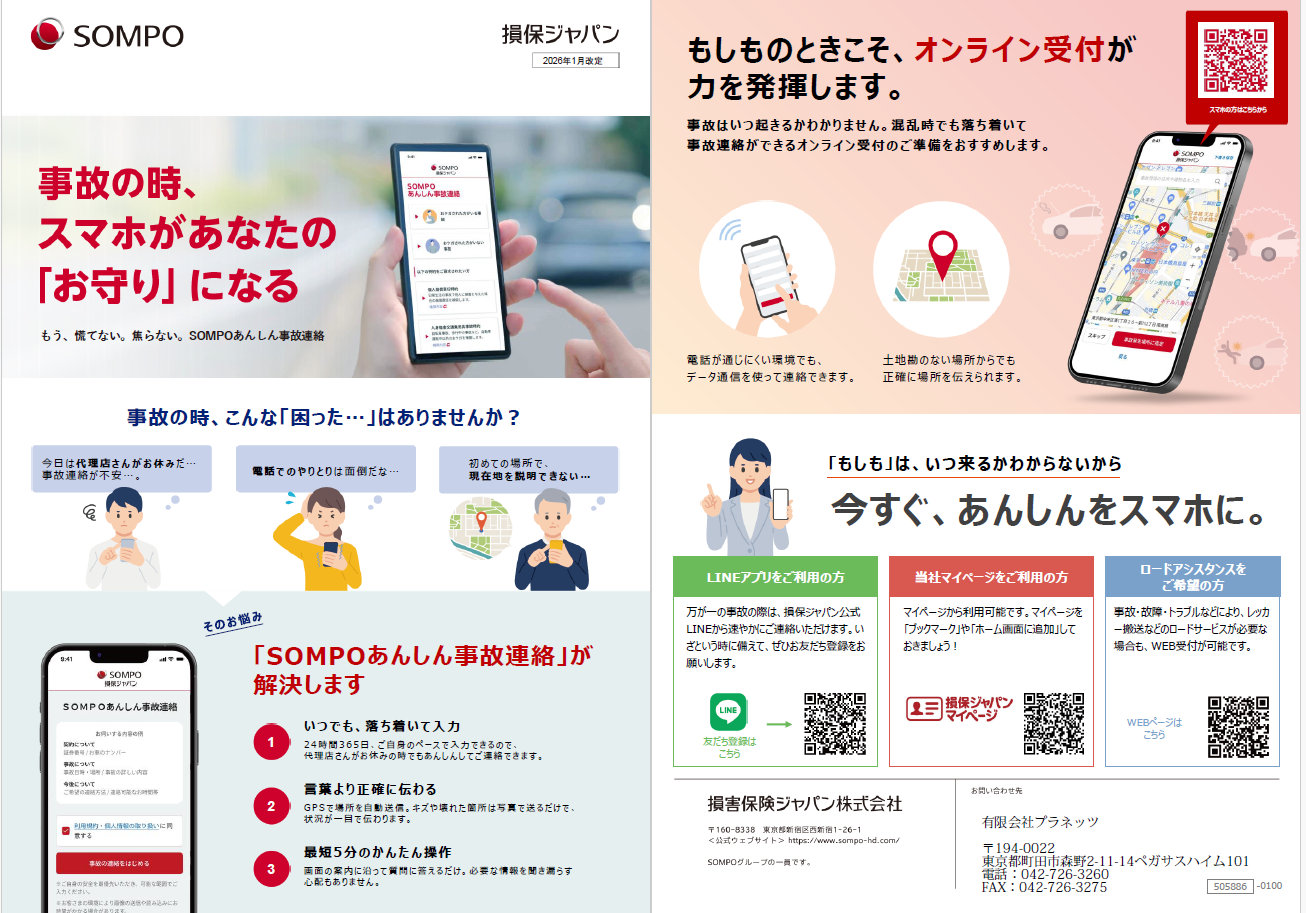 損保ジャパンの「SOMPOあんしん事故連絡」は、スマホやPCから24時間365日、GPS位置情報や現場写真を用いて簡単に事故報告できるオンラインサービスです。緊急時は電話(0120-256-110)も対応可能で、AI活用により事故報告からスムーズな対応へ繋げます。